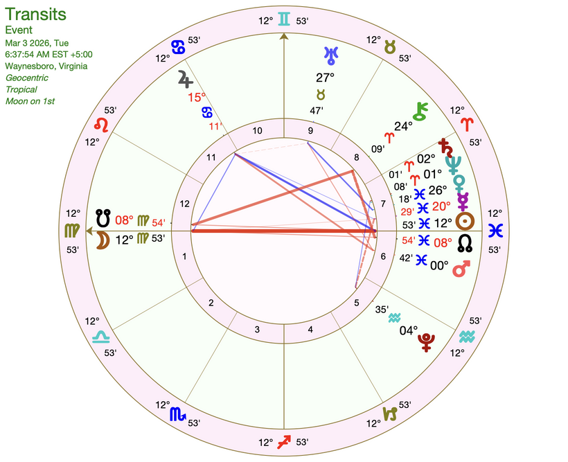 So-so news – the Lunar Eclipse’s ruling planet, Mercury, is weak. Mercury is retrograde and in the sign of its detriment, Pisces. I can see this popping up barriers to communication, especially if there is a bad faith dealer, or someone hiding from the consequences of their actions. Mercury in Pisces can be quite an avoidant energy that gets frustrating for people who are used to communicating more directly and straightforwardly. Be cautious in situations where you don’t know what you don’t know.