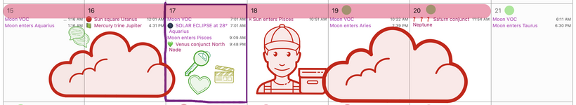 You might have more energy to play and move around as the week unfolds and Mars in cold Aquarius moves closer to aspect with Chiron in hot Aries. Maybe the frozen world– whether yours is literal ice like mine or emotional, metaphorical ice in your life– something frozen might just thaw out a bit around the end of the week as Mars sextiles healing Chiron, also in Aries– allowing for forward progress on a years-long journey of healing invisible wounds to your sense of self.